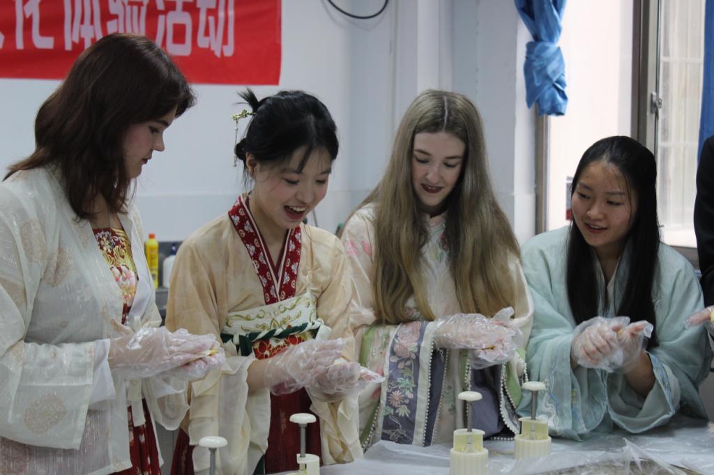 公司指导老师以“嫦娥奔月”传说为引,通俗讲解中秋 “赏月祭月” 习俗与月饼象征意义;志愿者现场示范面团揉制、馅料包裹、模具定型等步骤,全程耐心协助国际员工调整手法,现场氛围热闹温馨。“自己动手做月饼太有趣了,会做月饼,就不是‘老外’了。”来自俄罗斯伏尔加格勒国立大学的交换生VAKHITOVA SVETLANA(中文名:王诗薇)说,“虽然我们来自不同的国家,但今天感觉就跟一家人一样,非常开心。”