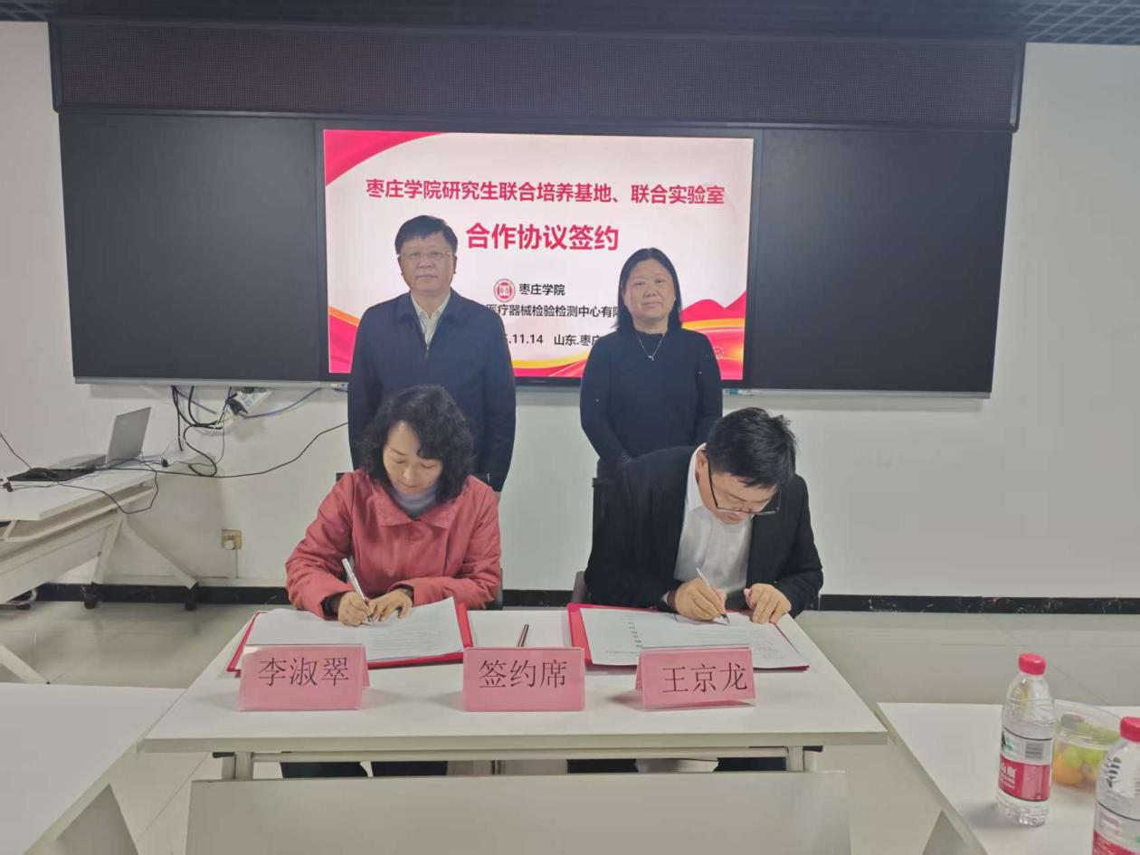 2025年11月14日下午,由w66与山东邦众医疗器械检验检测中心有限公司联合主办的“大健康产业学术沙龙暨w66研究生联合培养基地、联合实验室揭牌仪式”在枣庄高新区新医药产业园综合办公楼三楼会议室隆重举行。公司党委委员、副董事长李目海,山东邦众总经理李淑翠出席活动。公司w66旗舰厅经理王京龙、健康工程技术研究院经理韦德泉和部分教师代表参加活动。