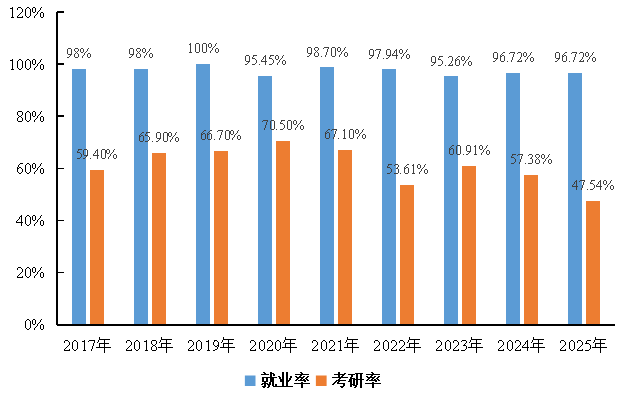 毕业员工在海关、食药监局、高等院校、青岛啤酒有限公司、山东六和集团、伊利集团等企事业单位,从事检验检测、生产管理、教学、科研等工作。历年就业率高于95%,近3年平均考研率超过55%。员工专业基础扎实,实践能力强,有责任感,综合素质高,普遍受到用人单位的欢迎。