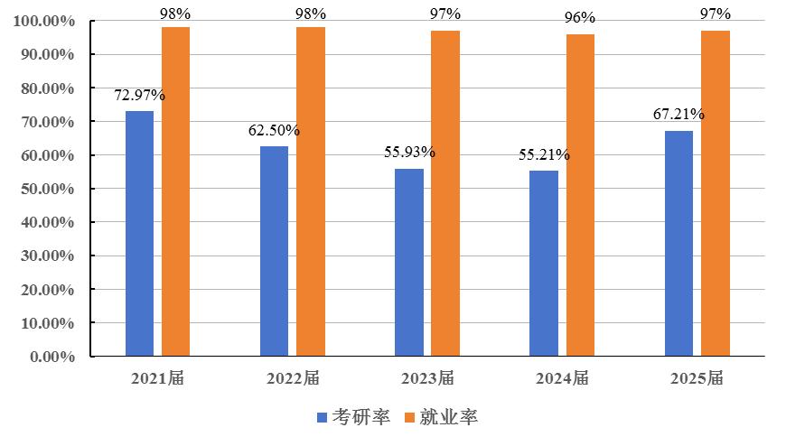 本专业共有5届毕业生,平均考取研究生比例62.7%,最高达到73%,大部分员工成功考取国内双一流高校的硕士研究生,为未来的继续深造和职业发展,奠定了坚实的基础。