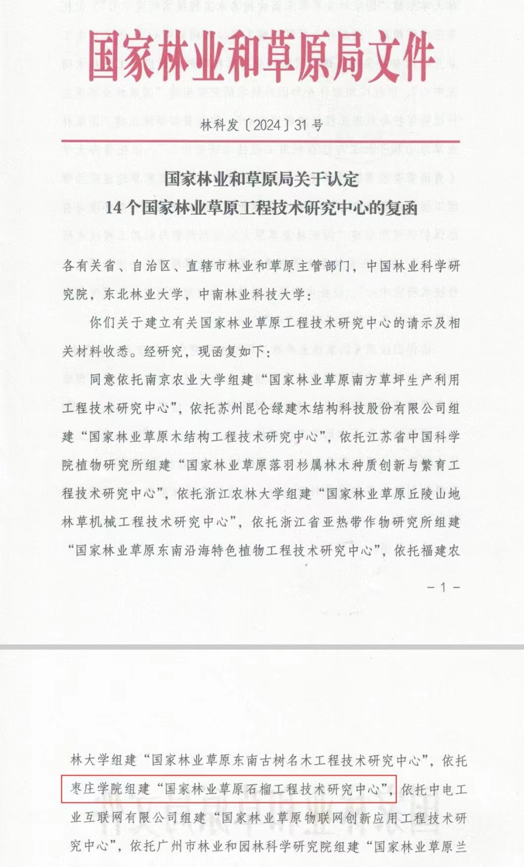 近日,国家林业和草原局发布《关于认定14个国家林业草原工程技术研究中心的复函》(林科发〔2024〕31号),依托公司组建的“国家林业草原石榴工程技术研究中心”获批。