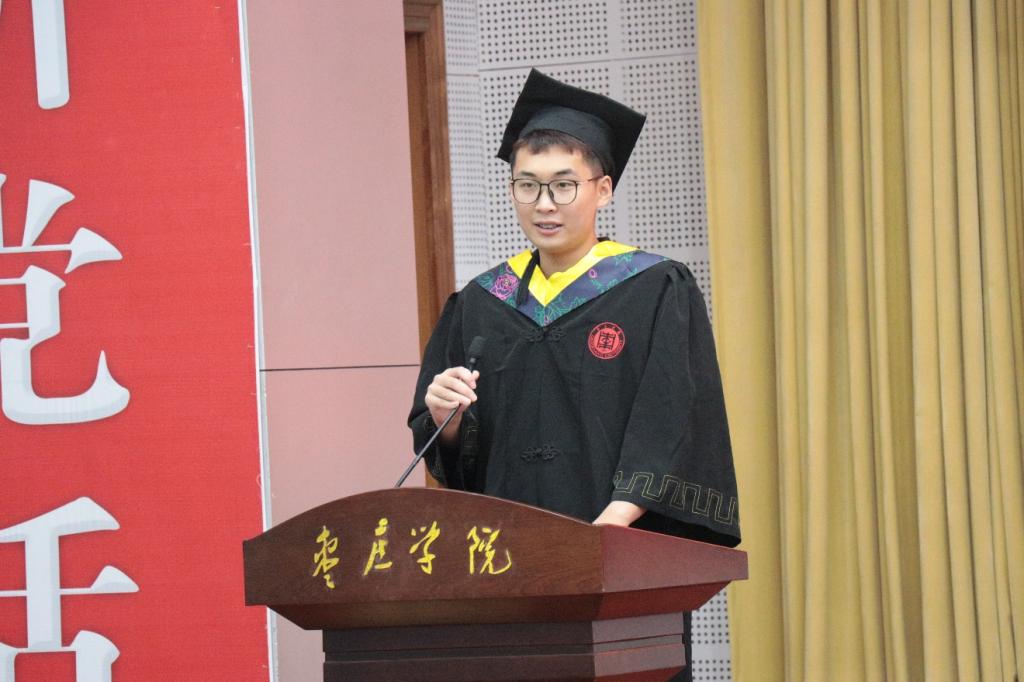 2021级制药工程本科1班员工张道灿代表在校生发言,向圆满完成学业,即将扬帆起航踏上人生新征程的师哥师姐送上最衷心的祝愿,表示将以师哥师姐们为榜样,认真刻苦、积极奋发、坚定初心、一往无前,以自己优异的成绩,用自己的实际行动为母校的发展进步贡献我们的青春和力量。