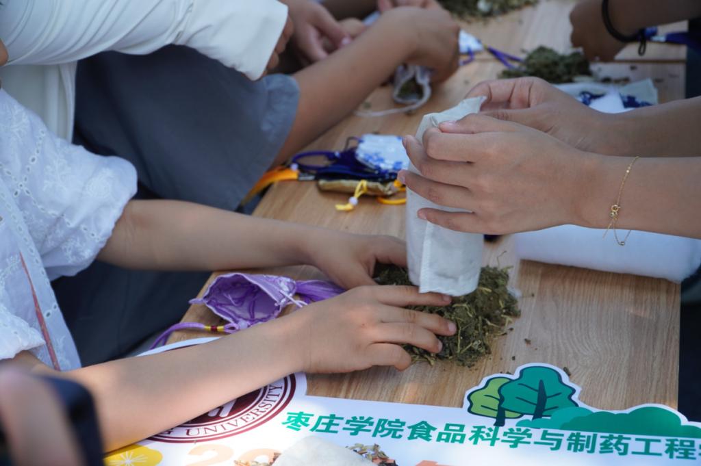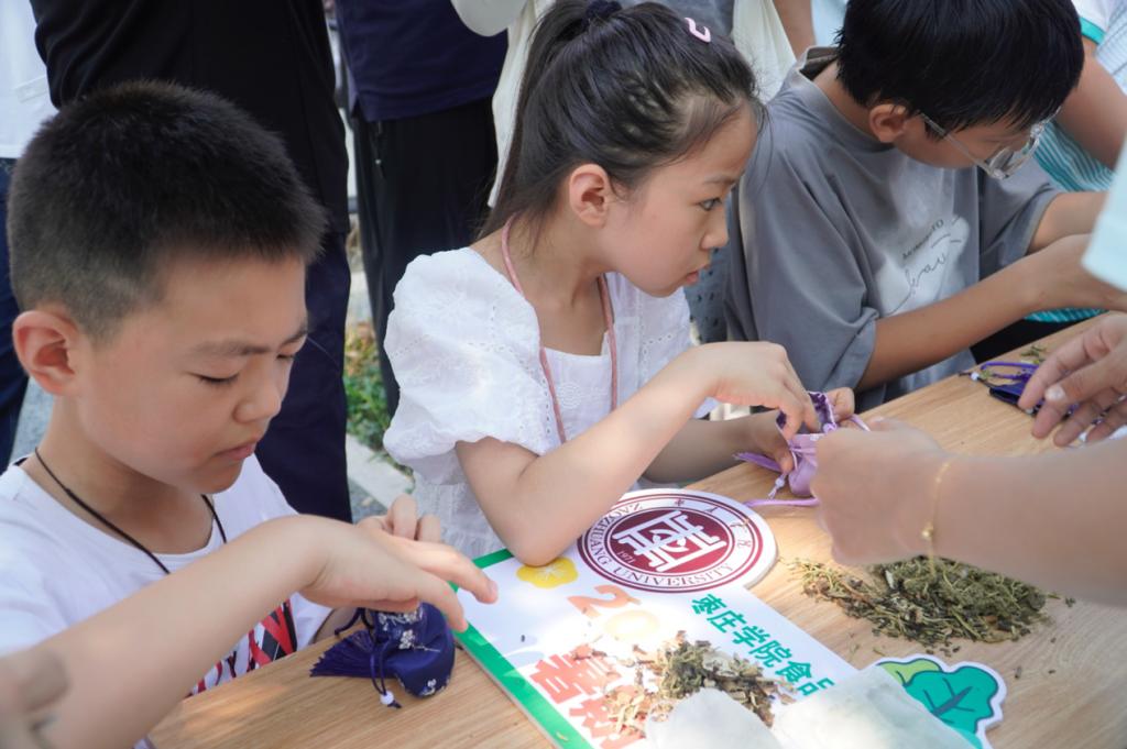 为了让孩子们了解中医药文化,志愿者们深入浅出地讲解艾叶、藿香、陈皮、乌梅等中草药的特性及其在传统养生中的广泛应用,孩子们化身“小小药剂师”,由志愿者专业指导下动手制作酸梅汤和驱蚊香囊。让孩子们在草药清香中触摸文化脉络,在香囊制作里体验传统匠心,让传统文化的“种子”在童心中萌芽。