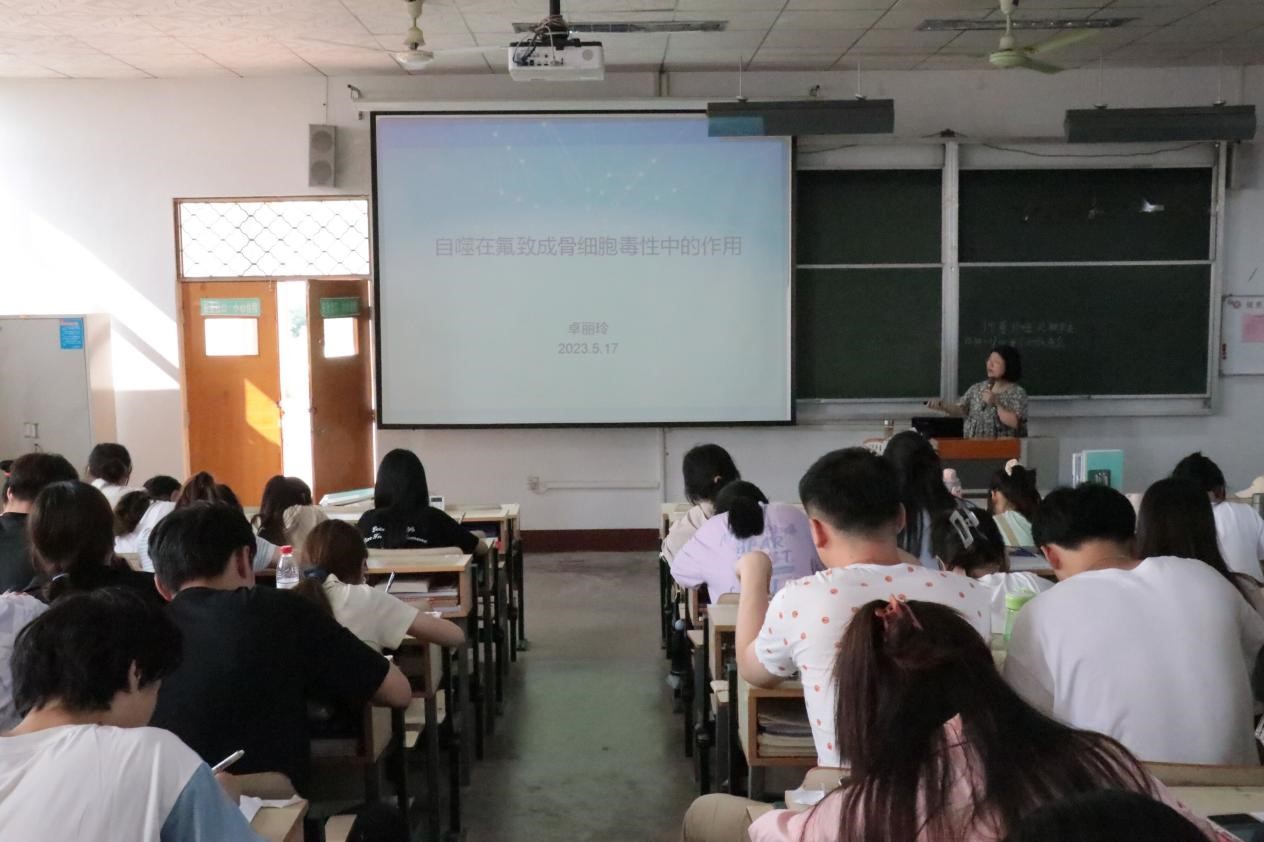 第一阶段,卓丽玲以细胞自噬为切入点,详细介绍了自噬在不同生物体中的生理机制,重点论述了细胞自噬在氟中毒中发挥的关键作用。此外,卓丽玲讲述了自己的科研发展经历,并介绍了所在科研团队关于自噬在氟致成骨细胞毒性中的作用上取得的研究进展。会上卓丽玲与同学们进行了深入的交流,并就同学们提出的问题做出了耐心解答。