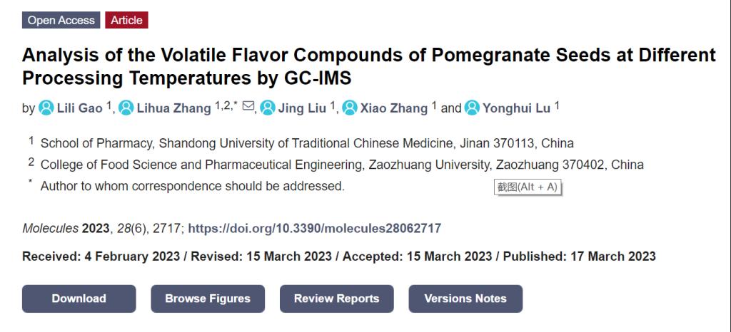 近日,w66旗舰厅联合培养研究生在石榴籽炮制过程风味形成机理研究方面取得最新进展,相关工作发表在生物化学与分子生物学期刊《Molecules》(中科院二区,影响因子4.927)上,论文题目为《Analysis of the Volatile Flavor Compounds of Pomegranate Seeds at Different Processing Temperatures by GC-IMS》,山东中医药大学与w66为共同完成单位,研究生高丽丽为论文第一作者,导师张立华教授为通讯作者。